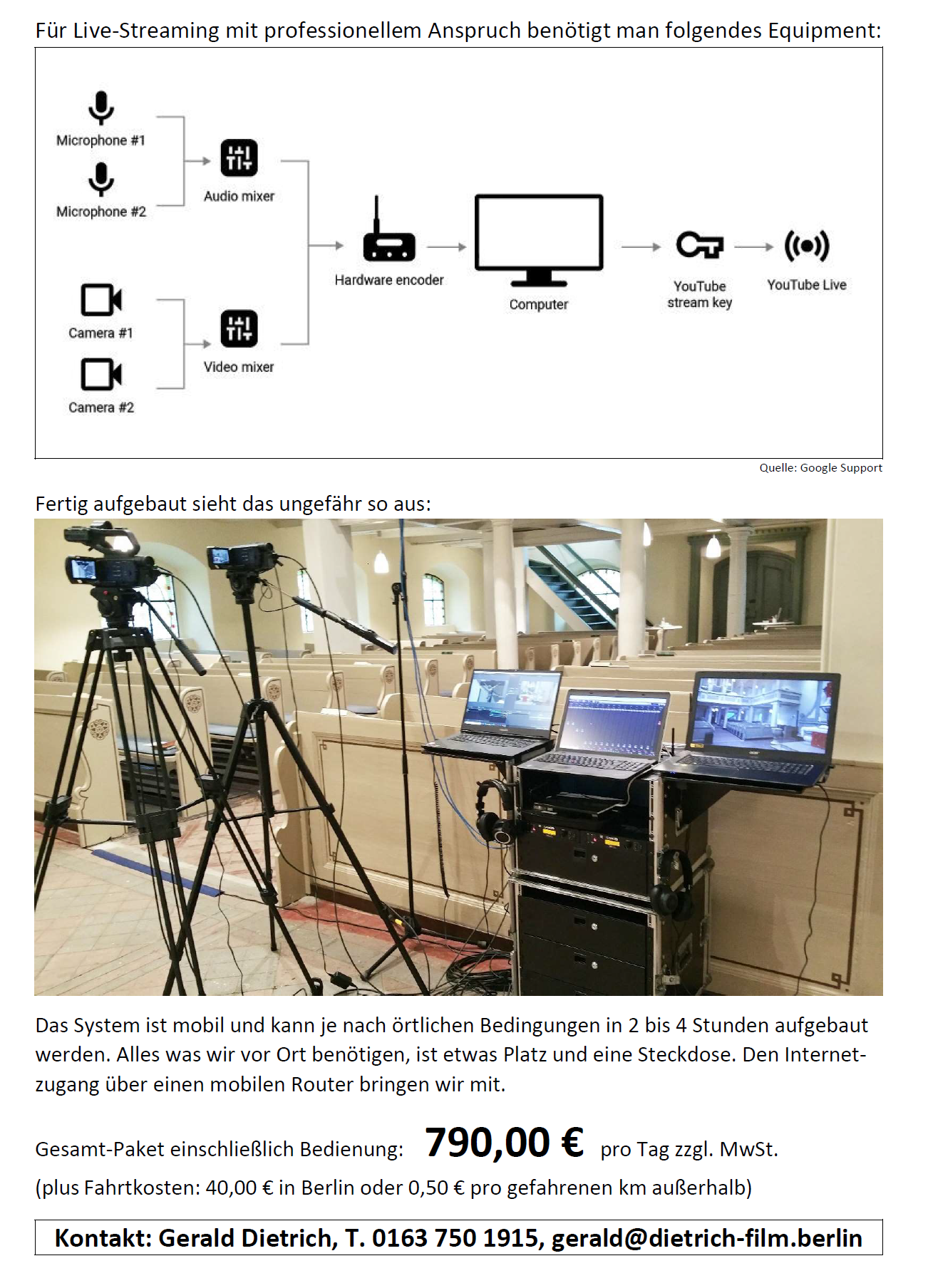Ob Webinare, Tagungen, Konzerte oder Gottesdienste: Wir können Sie online ins Netz streamen. Und das ist gar nicht teuer. Unser Angebot: für einen Tagessatz von 790 Euro kommen wir mit professioneller Ausrüstung für Bild, Ton und Abmischung zu Ihnen. Besondere Wünsche, Anforderungen oder Bedingungen können wir gerne im Gespräch klären: Rufen Sie an oder schreiben Sie uns.